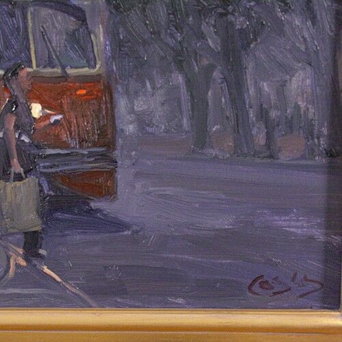 "6:00 STOP" BY JOHN COSBY OIL ON CANVAS SIGNED LOWER RIGHT 24" x 24"