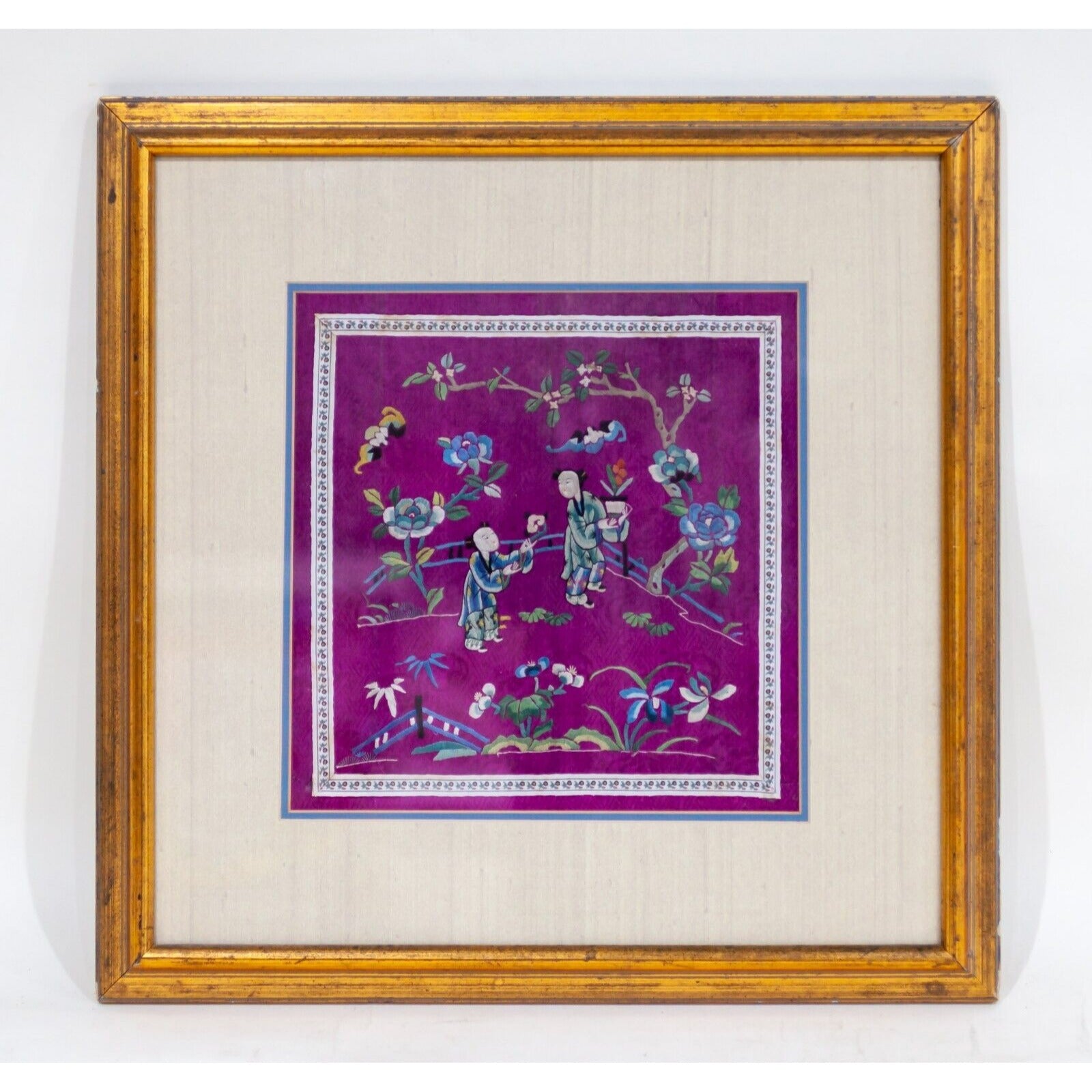 Chinese Qing Dynasty Purple Silk Embroidered with Figures and Birds Framed