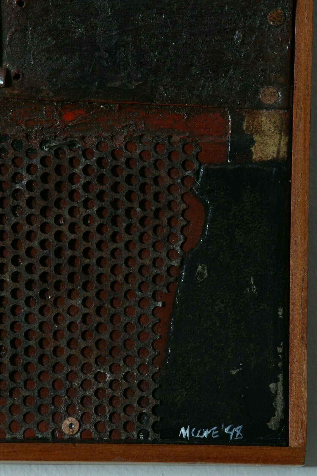 - Features various elements (nails, wire, newsprint, grating, etc.) and paint on canvas