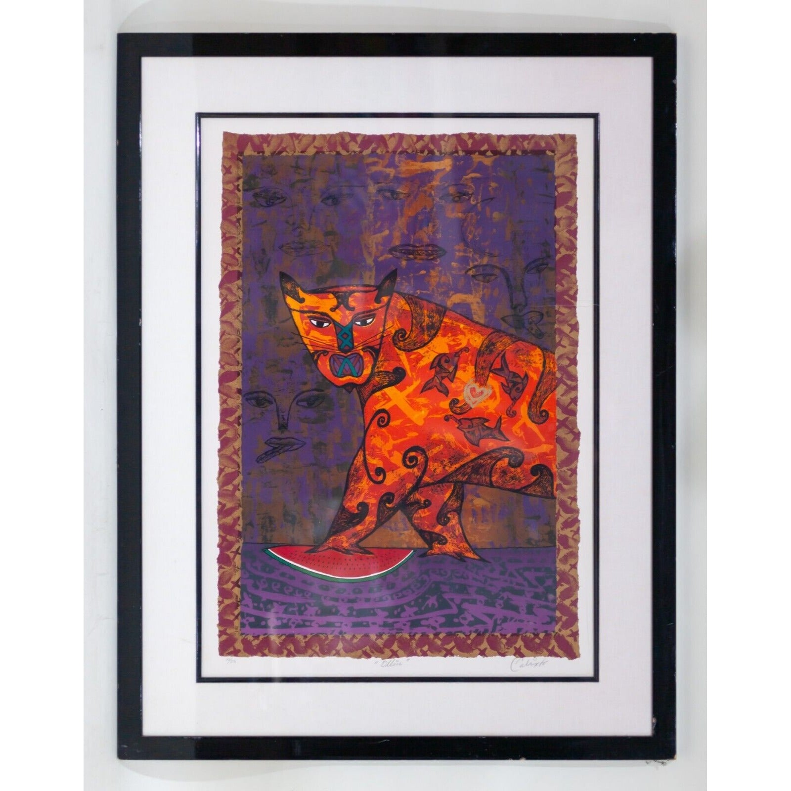 Gorgeous silkscreen of a big cat and a watermelon
