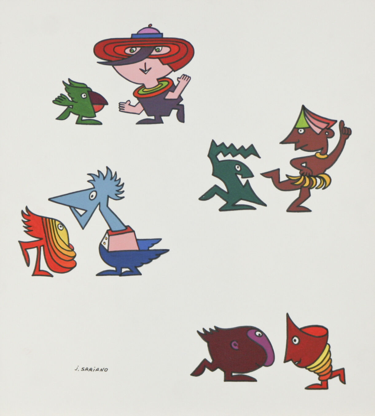 Born May 30th, 1943 in Oran, Algeria. Jean Sariano attended the School of Beaux-Arts of Oran the School of Beaux-Arts of Clermont-Ferrand, the School of Beaux-Arts in Paris, Pratt Graphic Center, New York, and finished his studies at the Printmaking Workshop, in New York in 1970. The contemporary pop characters of Jean Sariano's work are bright and alive, filled with spirit, reflecting the refreshing view of the young. (Source:RoGallery)