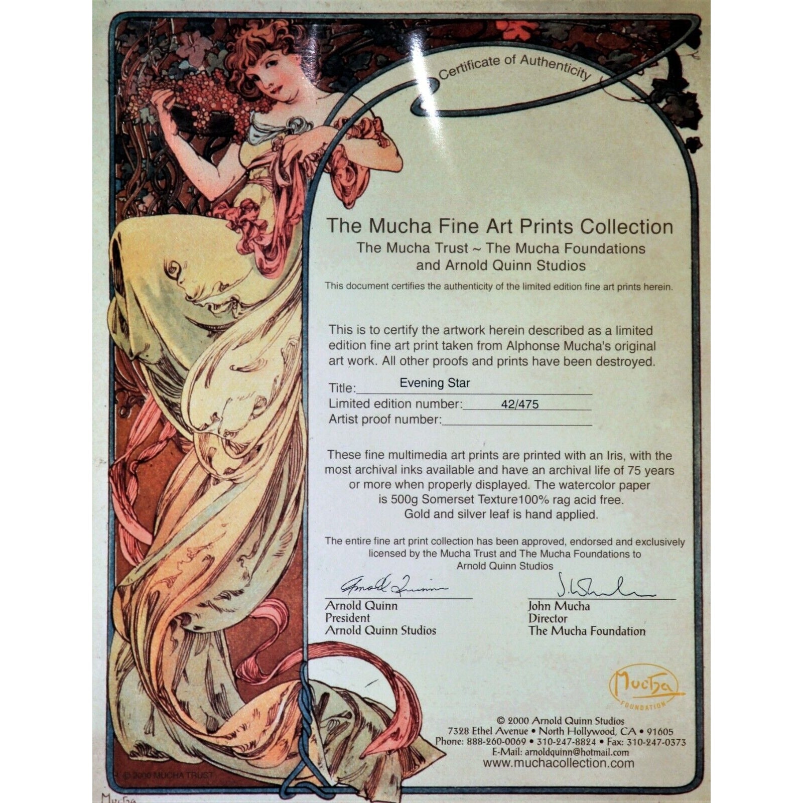 - COA issued by The Mucha Trust / The Mucha Foundation & Arnold Quinn Studios (North Hollywood, CA)