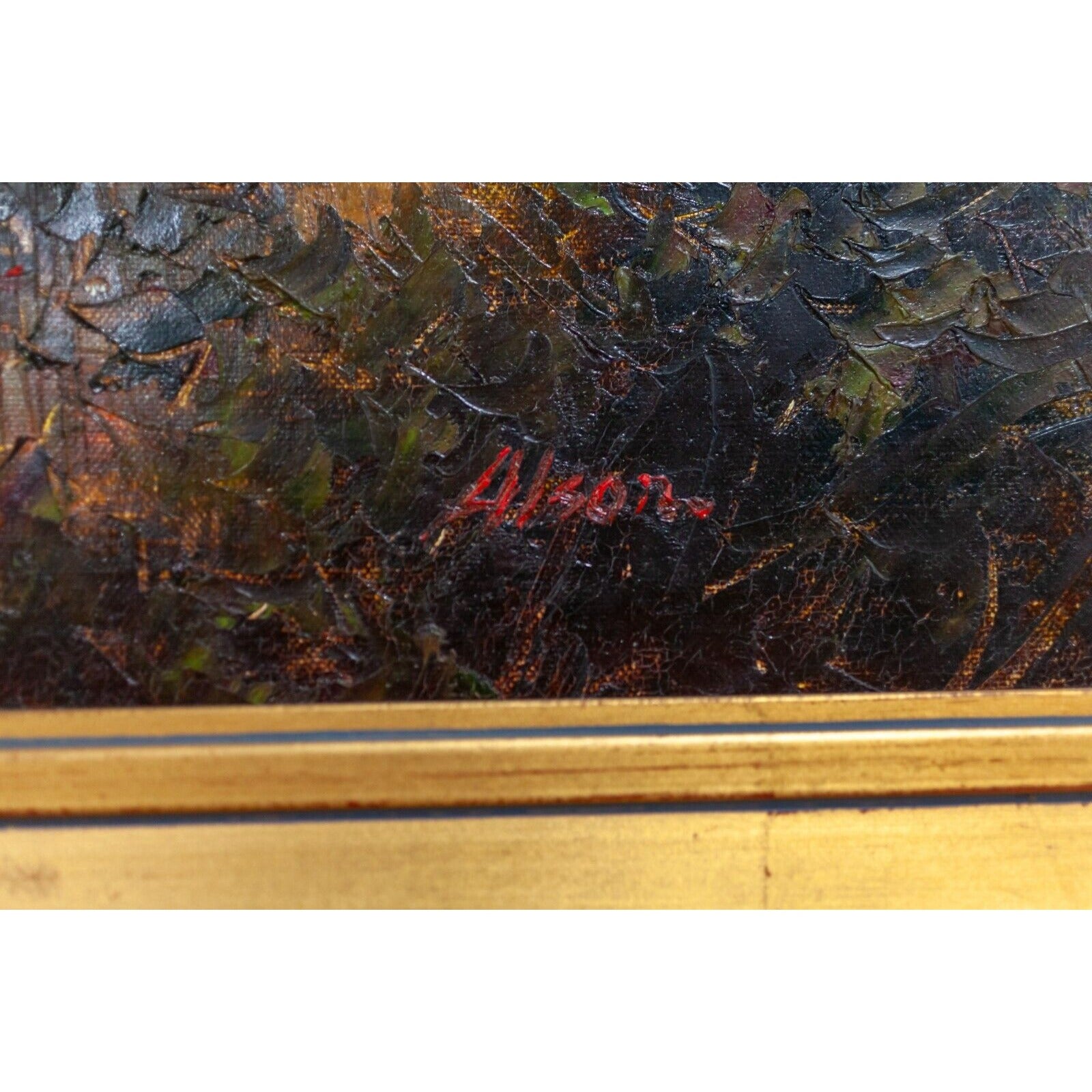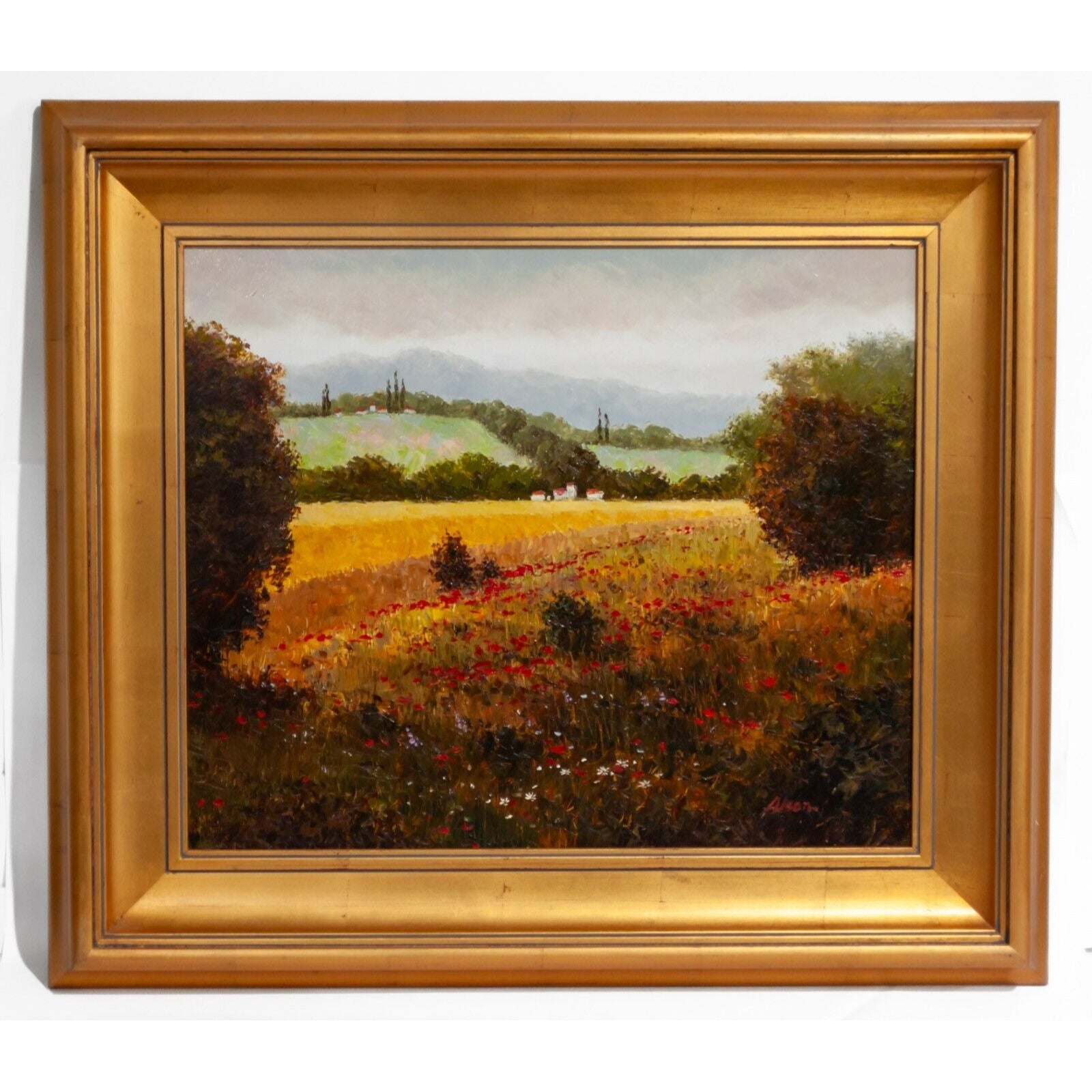 • Landscape painting of meadows with flowers, pond, hills, trees, farmhouses